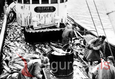 Tekin 10 apríl 1965. Ísleifur 3. Sjómenn landa fullfermi af þorski.
