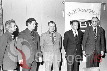 Tekin 1. febrúar 1976. Axel Ó. Lárusson, Adolf Óskarsson, Kristinn Sigurðsson á Skjaldbreið, Guðjón Halldórsson og Magnús Grímsson á Felli, fá gullmerki ÍBV fyrir vel unnin störf.
