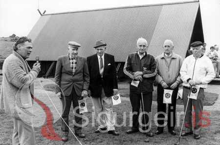 Ragnar Guðmundsson, formaður ásamt stofnendum Golfklúbbs Vestmannaeyja, Júlíusi Snorrasyni frá Hlíðarenda, Guðlaugi Stefánssyni frá Gerði, Guðlaugi Gíslasyni, Jóhannesi Gíslasyni og Jóhanni Vilmundarsyni.