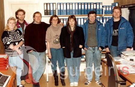 Eigendur og starfsmenn Skipaafgreiðslu Vestmannaeyja. Elín Leifsdóttir, nafn vantar, Bragi Júlíusson, Sigþóra Björgvinsdóttir, Kristbjörg Grettisdóttir, Sigurður Þórarinsson og Ægir Pálsson.