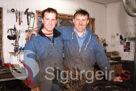 Tekin á Hjólbarðastofu Vestmannaeyja í desember 1995. Feðgarnir Magnús Bragason og Bragi Steingrímsson.