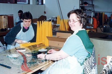 Til hægri er Sóley Ólafsdóttir við vinnu sína í Kertaverksmiðjunni Heimaey, nafn vantar á konuna til vinstri.