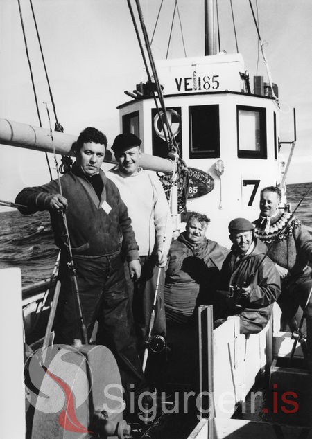 Áhöfnin á Skúla Fógeta VE-185 að "kippa". Nöfn vantar.