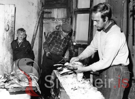 Jón Guðleifur Ólafsson í Laufási og Ragnar Runólfsson í Bræðratungu verka fýl, Allan Ragnarsson fylgist með.