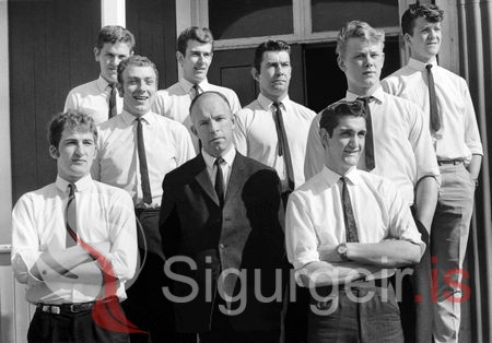Stýrimannaskólinn í Vestmannaeyjum: Aftari röð Kristinn Þ. Sigurðsson, Ívar Baldursson, Finnbogi Finnbogason, Axel Jóhann Ágústsson. miðju röð Logi Snædal Jónsson, Eiríkur Sigurgeirsson, fremsta röð Bjarki Kjartansson, skólastjórinn, Guðjón Ármann Eyjólfsson,Sigurður Helgi Sigurðsson.