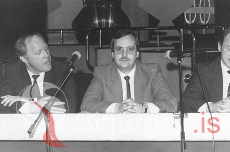Tekin í spurningakeppni milli félagasamtaka í bænum sem Pálmi Lórenzson stóð fyrir á Skansinum. Sennilega um 1983 -1985. Þetta er lið Rótarýklúbbs Vestmannaeyja, talið frá vinstri: Einar Steingrímsson, Stefán Sigurjónsson og sést lítillega í Kristján Ólafsson.