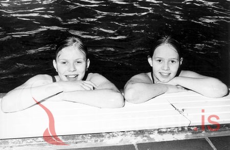 Tvær ungar Eyjadömur í sundlauginni. Jóhanna Birgisdóttir og Jóhanna Jóhannsdóttir.