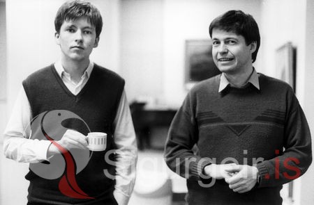 Jón L. Árnason og Guðmundur Sigurjónsson, skákmeistarar á léttu spjalli.