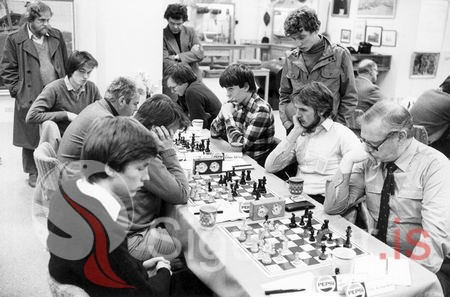 Mikið spáð í taflið, þekkja má Lúðvík Bergvinsson, Jón L. Árnason, Helga Ólafsson.