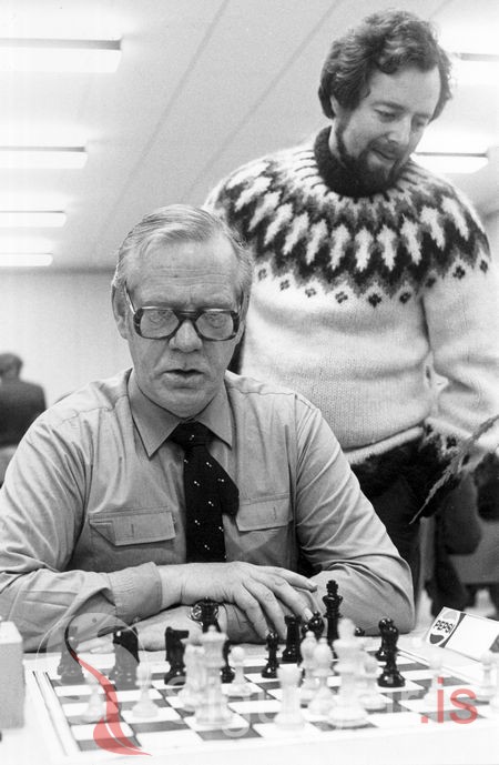 Hér er Kári Sólmundarson í þungum þönkum, Sigurgeir Jónsson frá Þorlaugargerði fylgist vel með.