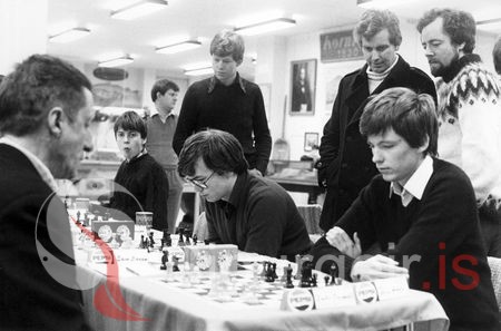 Jón L. Árnason og Margeir Pétursson eru þungt hugsi yfir skákinni, Jón Hauksson, lögfræðingur og Sigurgeir Jónsson, kennari fylgjast með.