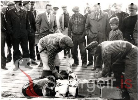 Gert að hval við höfnina.