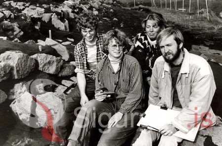 Fornleifafræðingar við uppgröft á Herjólfsbæ í Herjólfsdal. Fremst eru Margrét Hermannsdóttir Auðardóttir og Þorlákur Helgason.