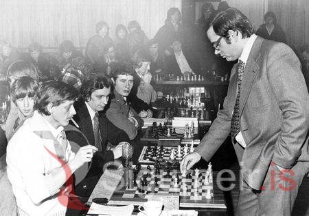 Fjöltefli í Alþýðuhúsinu. Björn Ívar Karlsson, skurðlæknir, Jón Hauksson, lögfræðingur, Óskar Sigmundsson, nafn vantar á skákmeistarann.