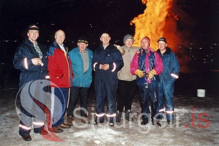 Þessir sáu um þrettándabrennuna, Kristmann Kristmannsson, múrari, Eðvald Sigurðsson, Gísli Einarsson, Sigursteinn Óskarsson frá Hálsi, Guðmundur Þ. Eyjólfsson, Kári Vigfússon, og Sigurður Georgsson.