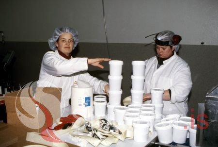Unnið við síldarpökkun hjá Íslenskum matvælum. Kolbrún Guðnadóttir og Stefanía Ársælsdóttir.