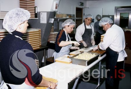 Unnið við að afgreiða mat til grunnskólanna. Hrafnhildur Sigurðardóttir, Dóra Kolbeinsdóttir, Halldór Sævar Grímsson og Grímur Þór Gíslason, kokkur.