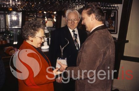 Gísli Valtýsson afhendir Guðfinnu Kjartaníu Ólafsdóttur og Erlendi Stefánssyni Fréttapýramídann.