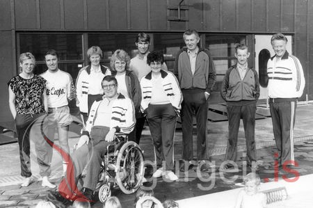Starfsfólk íþróttamiðstöðvarinnar í Vestmannaeyjum. Katrín Magnúsdóttir, íþróttakennari, Gísli Magnússon, íþróttakennari, Jórunn Helgadóttir, Halldór Jónsson, Ólöf Waage, Vignir Guðnason, forstöðumaður, Jóna Kristjana Guðmundsdóttir, Óskar Guðjónsson, Guðni Kristófersson og Ólafur Oddgeirsson.