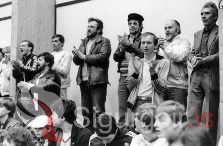 Eyjamenn duglegir að hvetja sína menn. Einar Ottó Högnason, Gylfi Garðarsson, Georg Þór Kristjánsson í Klöpp, Jónas Sigurðsson, Áki Heinz Haraldsson, Hörður Óskarsson, Sveinn Tómasson og Karl Marteinsson.