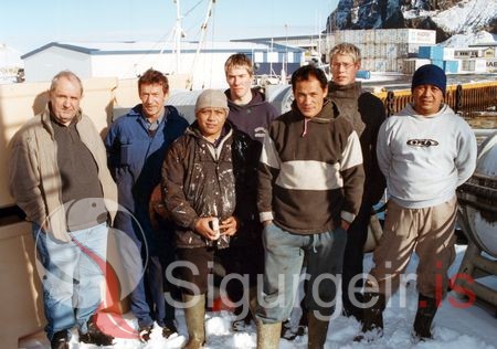 Áhöfnin á Byr VE. Eigendurnir, Sævar Brynjólfsson og Sveinn Valgeirsson, annar frá hægri er Leó Snær Sveinsson, nöfn vantar á hina mennina.