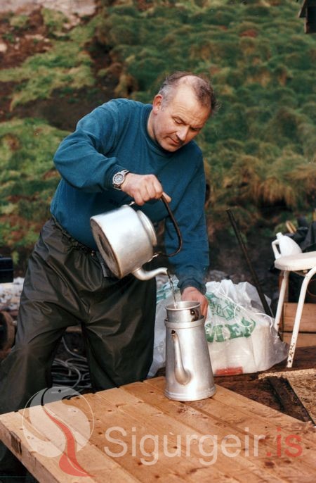 Verið að steypa undirstöður fyrir nýja húsið sem reist var eftir að það gamla eyðilagðist vegna moldarskriðu, Þórarinn Sigurðsson, rafvirkjameistari, hellir upp á kaffi í pásunni.