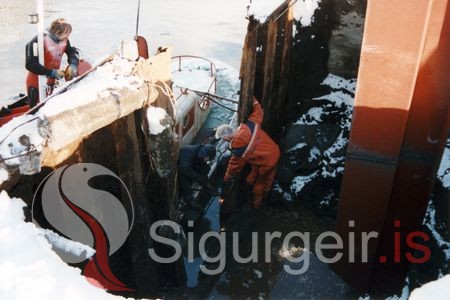 Viðgerð á Nausthamarsbryggju. Sigurður Óskarsson á Hvassafelli og Sigurður Elíasson frá Varmadal.