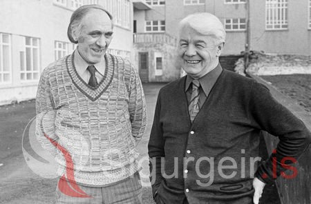 Vigfús Ólafsson frá Gíslholti, skólastjóri Gagnfræðaskólans og Jónas Sigurðsson frá Skuld, húsvörður. Myndin er tekin í febrúar 1976.