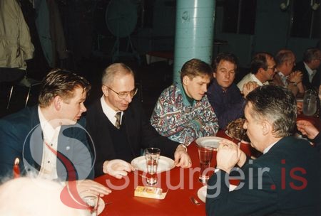 Sviðaveisla í Net h/f. Guðmundur Huginn Guðmundsson, Guðmundur Sveinbjörnsson, Ólafur Einarsson, Hjalti Elíasson frá Varmadal, Sigþór Ingvarsson og Gunnar Jónsson frá Miðey.