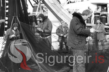 Netamenn frá Net h/f, við nótabætningu við skipshlið, Jóhann Georgsson, Sigurbjörn Óskarsson, Finnbogi Ólafsson, Haraldur Óskarsson og Haraldur Júlíusson.