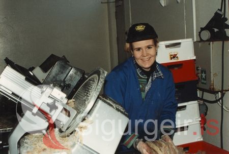 Júlía Bjarnadóttir sagar niður harðfisk í bitafisk í Gusti.