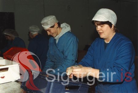 Unnið við harðfiskinn í Gusti, til hægri er Jólín Lilja Brynjólfsdóttir, nafn vantar á strákinn.