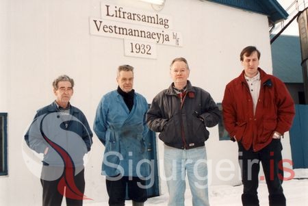 Starfsmenn hjá Lifrarsamlagi Vestmannaeyja. Alfreð Einarsson, Ólafur Sigurjónsson, Vilhjálmur Stefánsson og Jóhann Jónsson frá Laufási, eigandi.