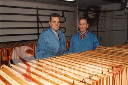 Ólafur Sigurjónsson og Vilhjálmur Stefánsson við vinnu sína í Lifrarsamlagi Vestmannaeyja.