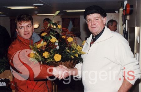 Birkir Agnarsson framkvæmdarstjóri Netagerðar Ingólfs færir Sævaldi Pálssyni blómakörfu í tilefni nýbreytinga á Berg VE-44.