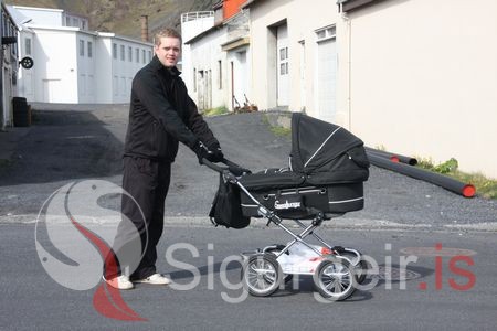 Guðmundur Ingi Guðmundsson á göngu með soninn Guðmund Huginn.