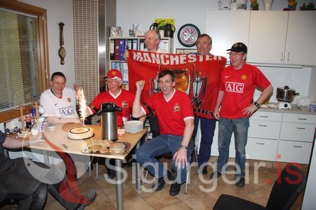 Þeir fögnuðu Englandsmeistaratitlinum hjá Manchester United, standandi eru Hörður Óskarsson, Friðrik Már Sigurðsson og Borgþór Yngvason, sitjandi eru Ívar Atlason, Egill Egilsson og Magnús Þorsteinsson.