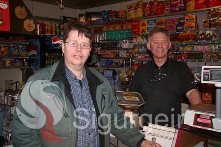 Tekin 5. maí 2006. Hjálmar Brynjúlfsson, rafvirki og Magnús Sveinsson, kaupmaður á Kletti í léttu morgunspjalli.