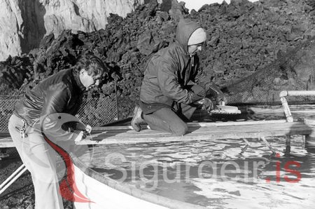 Silungaeldi á Skanssvæðinu. Hjörtur Hermannsson og Hörður Runólfsson fóðra seiði og mæla hitastigið í kerjunum.