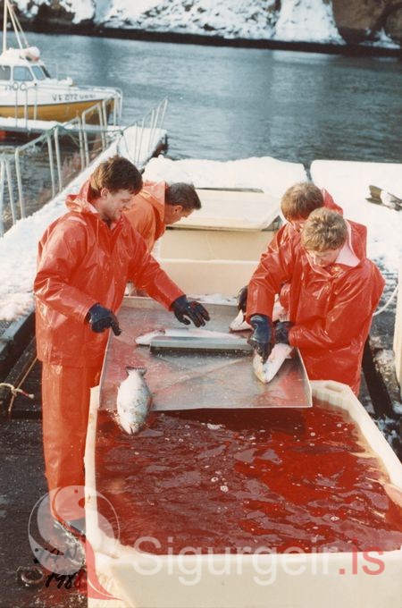 Laxaslátrun úti við kví í Klettsvík. Fremstir á mynd eru Erlendur Bogason og Guðni Georgsson.
