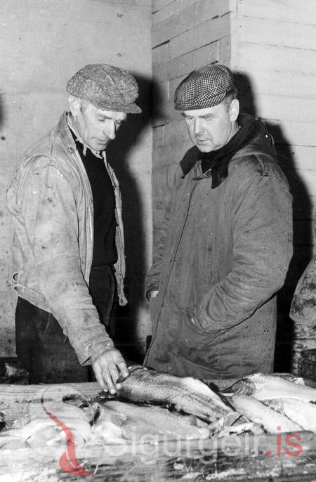 Skipstjórarnir fylgjast með matinu á dagsaflanum, Elías Sveinsson frá Varmadal og Einar Guðmundsson.
