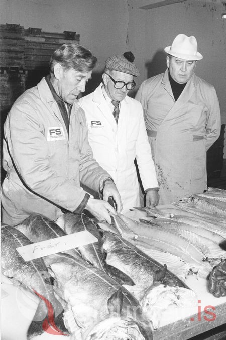 Ufsinn skoðaður og metinn, til vinstri er Ágúst Helgason, fiskmatsmaður, hinir tveir eru fiskmatsmenn úr Reykjavík.