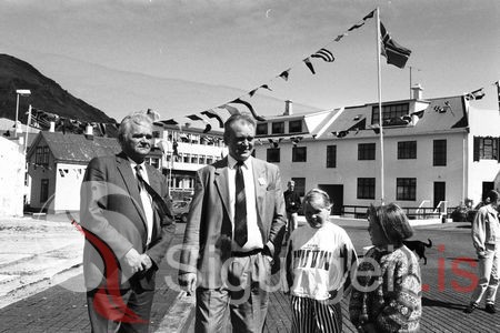Tekin á sjómannadaginn. Hafsteinn Stefánsson og Guðni Ólafsson, skipstjóri. Nöfn vantar á stelpurnar.