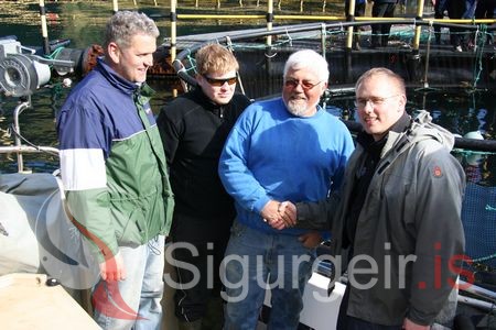 Tilraunir með Bleikjueldi í Klettsvíkinni.Lengst til hægri er Páll Marvin Jónsson við hliðina á honum er Guðmundu Adolfsson en nöfn vantar á hina mennina.