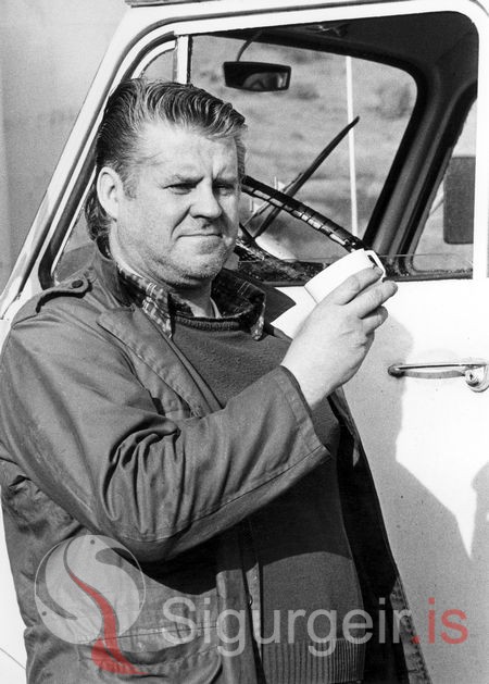 Nú verður að fá sér "sopann" á hlaupum. Einar Ágústsson, bílstjóri hjá Bifreiðastöð Vestmannaeyja. Myndin er tekin 10. mars 1978.