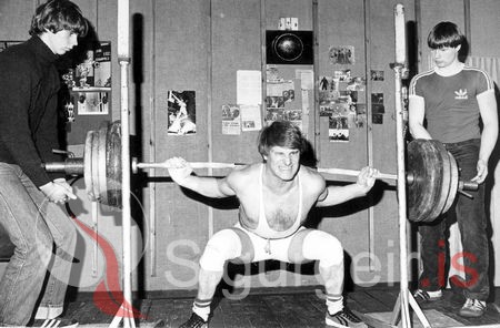 Vinstra megin er Björgvin Björgvinsson, Gunnar Alfreðsson er að lyfta og til hægri er Helgi Gunnarsson. Myndin er tekin 8. desember 1979, en árið 1971 varð Gunnar fyrsti Íslandsmeistarinn í 82,5 kg. flokki.