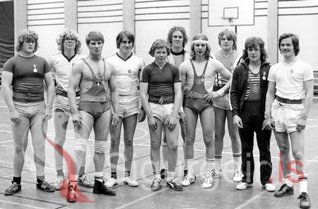 Hilmar Adolfsson, Haraldur Haraldsson, Gunnar Alfreðsson, Óskar Arason, Ómar Hreinsson, Jóhann Gíslason, Hermann Haraldsson, Jón Trausti Haraldsson, Gunnar Steingrímsson og Daði Garðarsson. Myndin er tekin 2. apríl 1977.