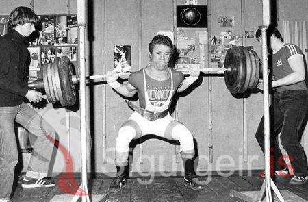 Jóhann Gíslason tekur hér vel á. Myndin er tekin 8. desember 1979.