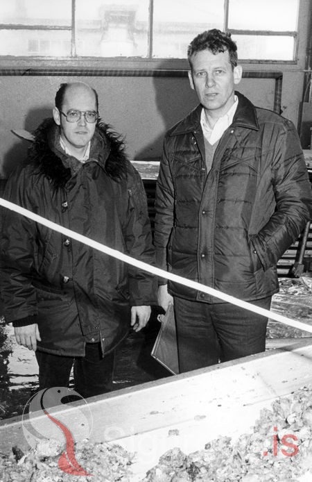Tekin 1. mars 1980 starfsmenn Samfrosts, Óskar Einarsson og Magnús Bjarnason frá Garðshorni, myndin er tekin í frystihúsi FIVE, áður Eyjaberg.