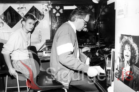 Tómstunda- og íþróttafulltrúi, Guðmundur Þ.B. Ólafsson opnar Jólarásina og þulurinn Ásgeir Hilmarsson fylgist með að allt gangi eðlilega fyrir sig. Myndin er tekin 18. desember 1987.